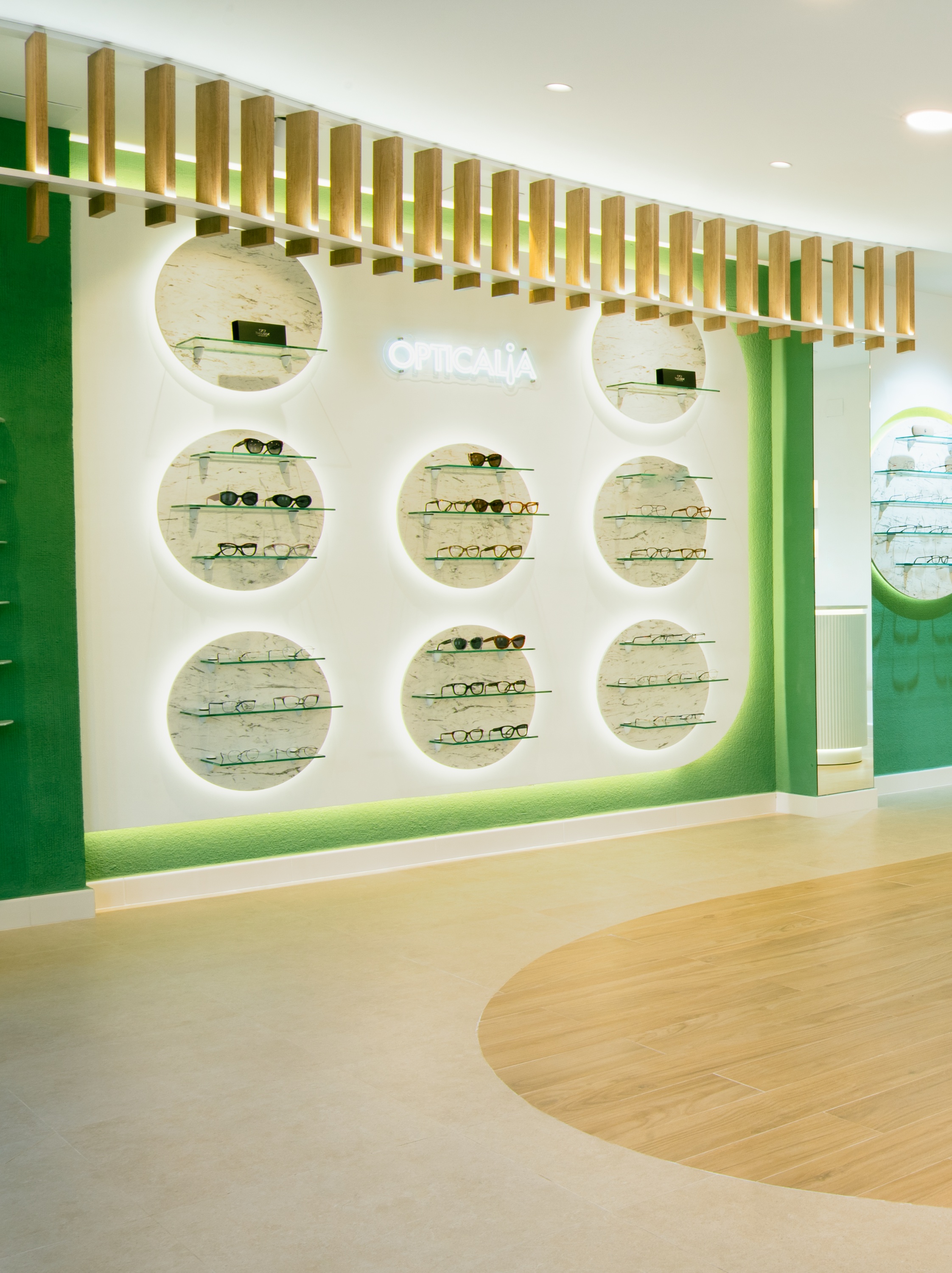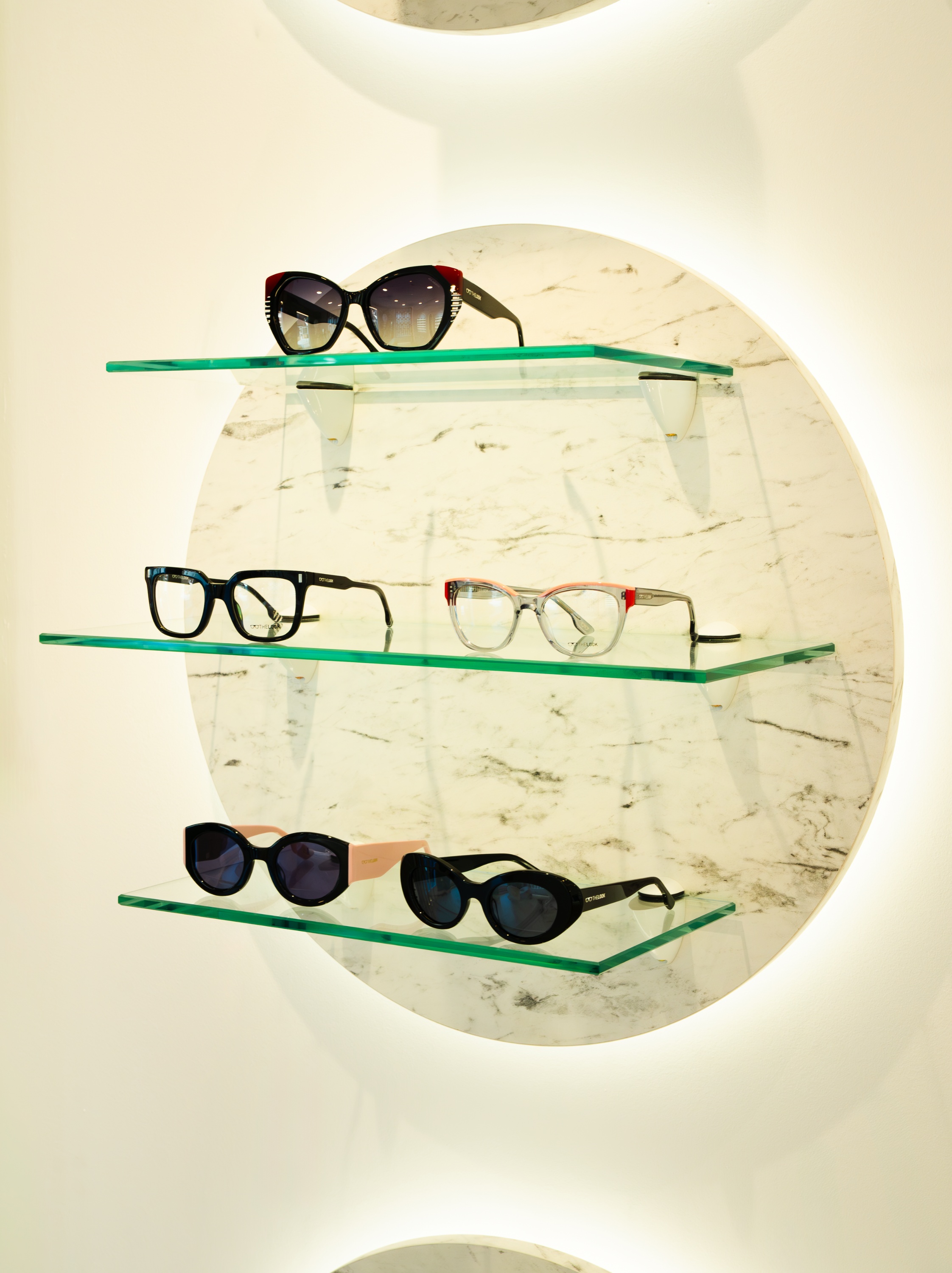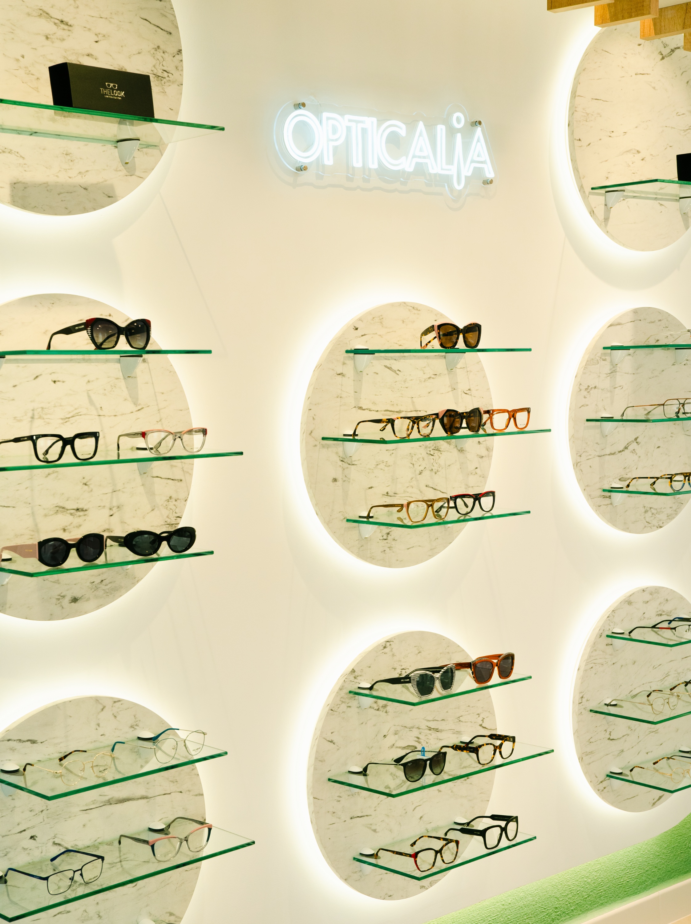 Expositor realizado con círculos en melamina símil mármol sobre alistona (R.0.30 cm). Iluminación led alrededor de los círculos en parte inferior. Baldas de cristal transparente con cantos pulidos y esquinas frontales redondeadas con perfil alusystem para amure de balda.
