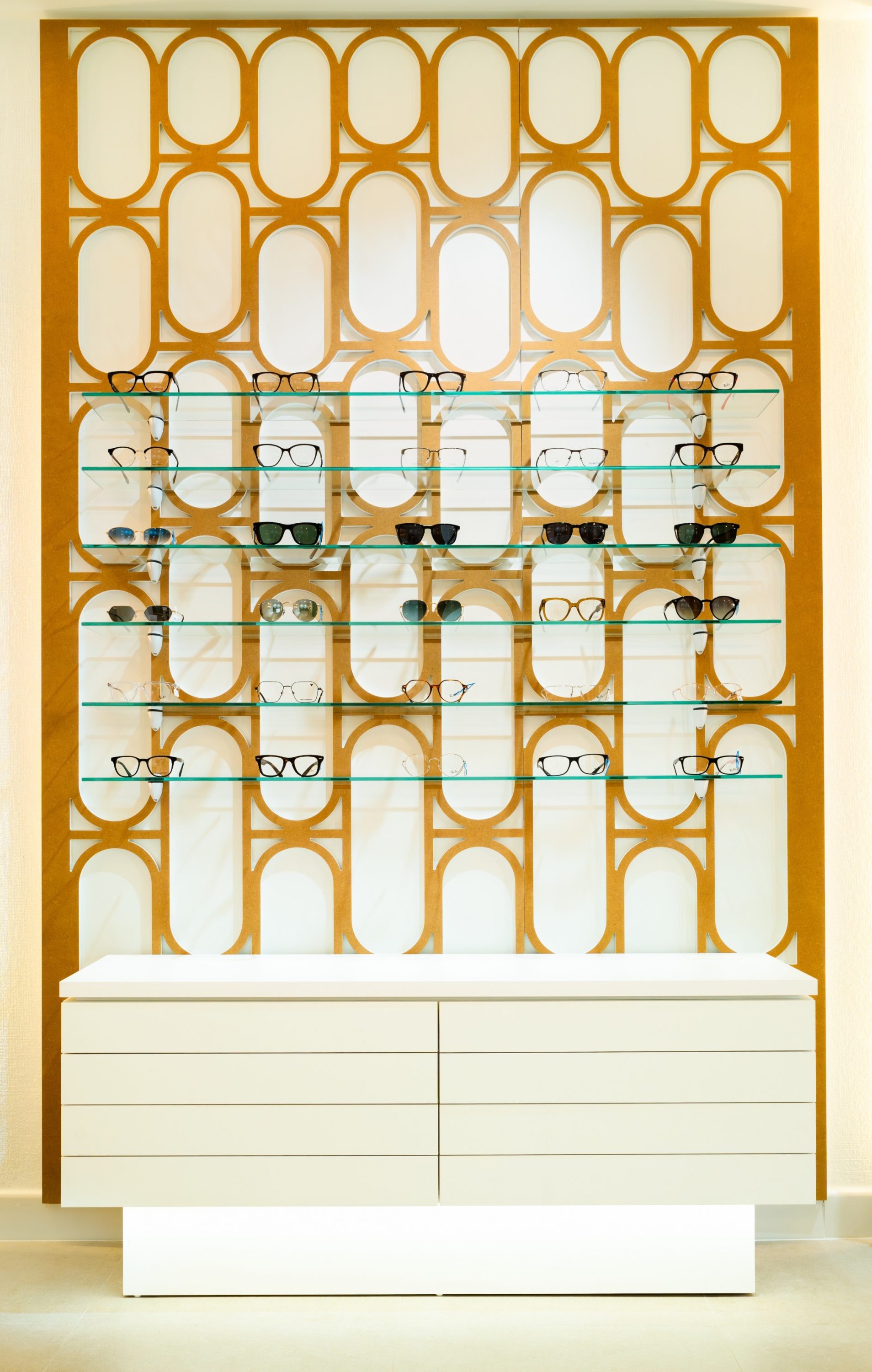 Tablero fresado en DM crudo con formas circulares. Fresado de 10mm de profundidad. Fondo en laca blanca. Baldas de cristal transparente 1400 x 8 x 200 con cantos pulidos y esquinas frontales redondeadas. No incluye cajoneras.