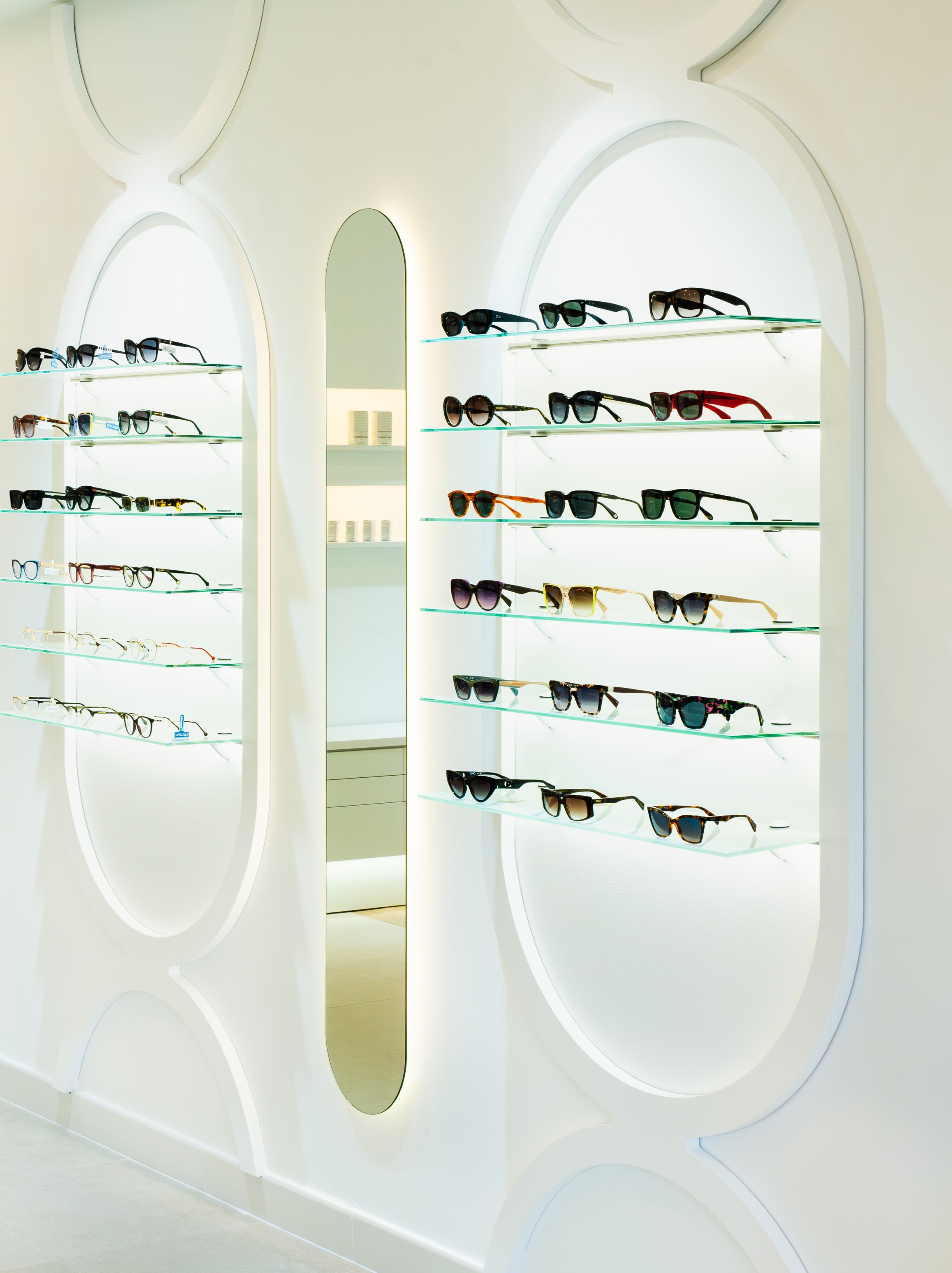 Expositor con formas curvas sin trasera, sujetas a pared. Canal interior en un lateral para cableado/iluminación de baldas. Baldas cristal lacobel blanco (830 x 8 x 200 mm) iluminación led en parte inferior posterior. Sujetas a formas curvas con pelicanos acabado blanco.