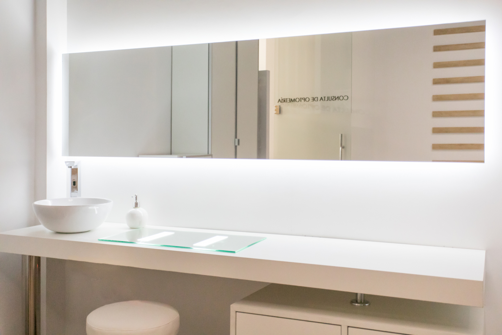 Miroir sur la surface avec double bande de verre sablé et éclairage intégré.