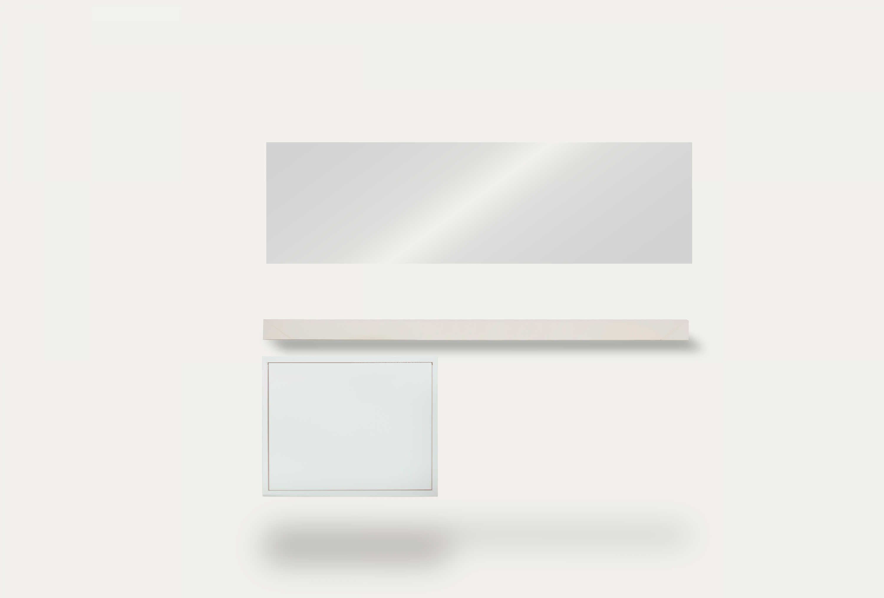 Meuble à corps épaissi de 60 mm réalisé en mélaminé finition blanche, suspendu au mur avec supports métalliques.