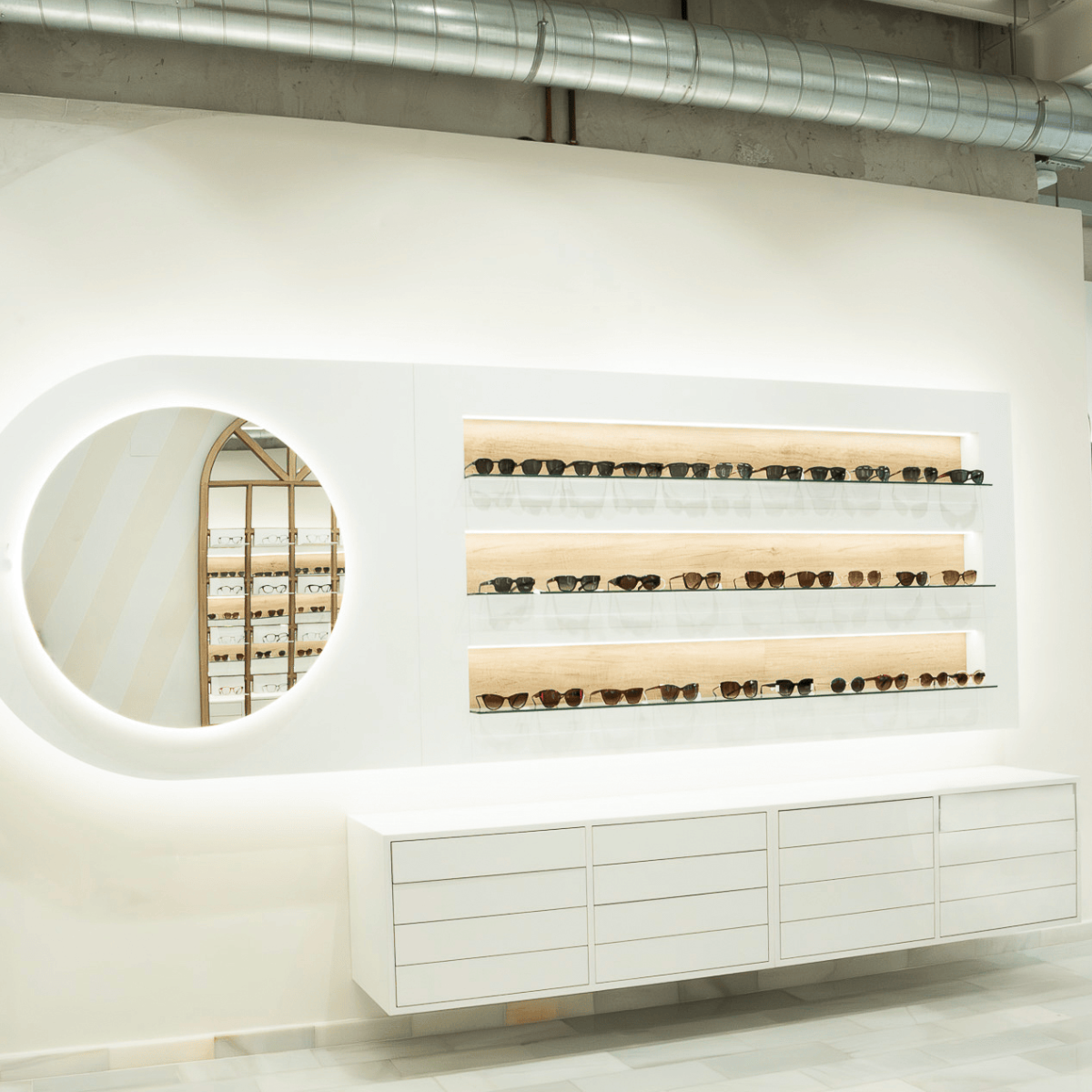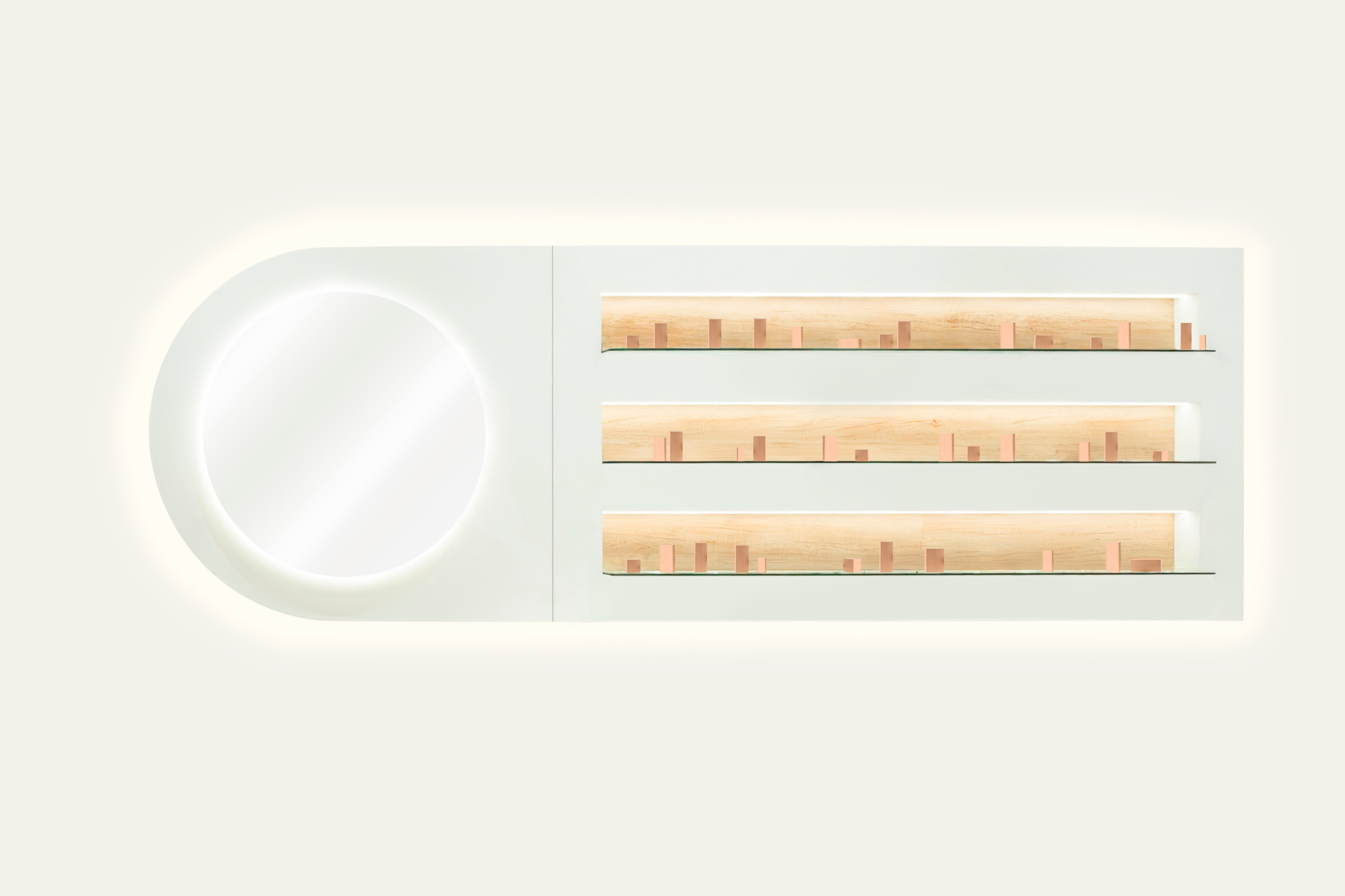 Présentoir mural composé de deux unités indépendantes. Réalisé en mélaminé finition blanche, avec un miroir de 900 mm doté d’un éclairage périmétrique, trois niches avec fond en mélaminé finition chêne et étagères suspendues en verre transparent.